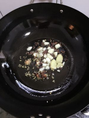 锅烧热后倒入油,放入姜蒜,茴香,三奈八角炒香