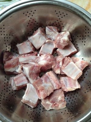 排骨切段,这个可以买时切好,大小适中,生排骨先用水泡一会,然后飞水,打掉血水以后捞出排骨
