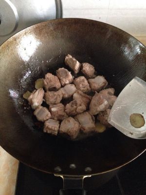 热油后,先下姜蒜爆香。然后下焯好的排骨,桂皮八角下锅。