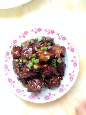 十五分钟后加少许盐转大火收汁,差不多就可以关火装盘了,然后切点葱花点缀下就可以了