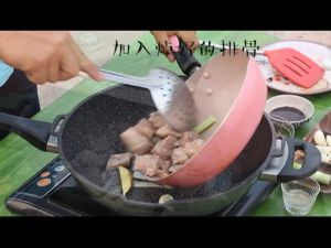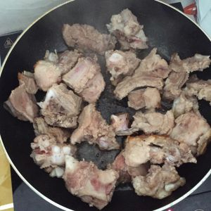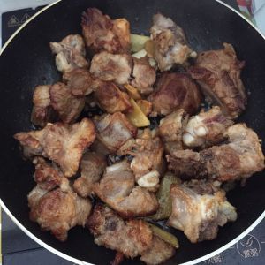热锅,加少许油,放几颗冰糖炒糖色,入排骨翻炒