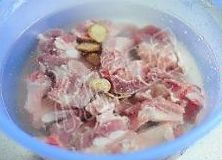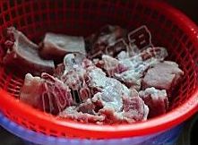 猪排骨一斤(以500g为例),剁成小块,在清水里浸泡15分钟,让血水充分浸泡出来,倒掉水,沥干水份。(这个步骤可以免焯水)