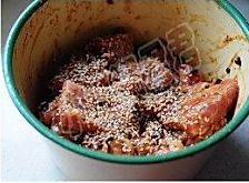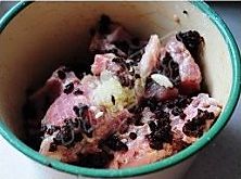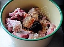 排骨放在大的容器里,加入豆豉半调羹,黄豆酱1调羹,老抽半调羹,白糖1调羹,料酒2调羹,油1调羹(调和油、花生油、猪油任何一种均可),用手抓匀。腌制15到20分钟之间。