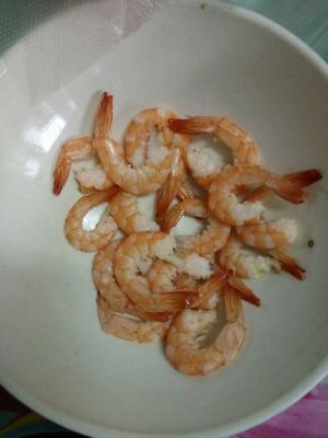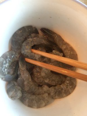 基围虾入开水焯一下(这样好剥壳) 去掉头 壳 注意:最后的尾巴要留着做造型哦