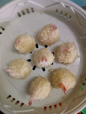 将虾依次裹上淀粉,鸡蛋,面包糠,如果觉得有些单薄可以重复裹鸡蛋和面包糠一次。