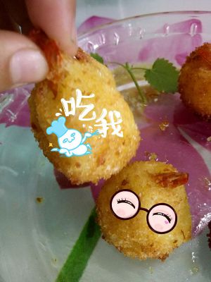 取一小块土豆泥,包入虾仁,尾巴要记得露出来噢