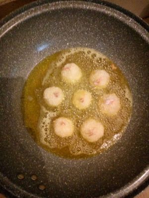 包好的土豆虾仁分别入面粉,蛋液,面包糠滚一下