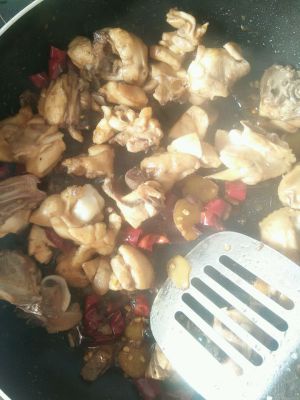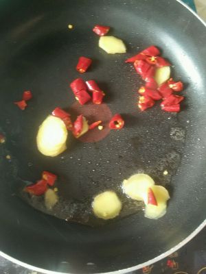 热油加入生姜干辣椒,炒出香味放入鸡肉
