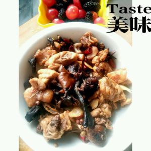 继续翻炒变色后加入水,淹没鸡肉,加入泡发的臻菇,花椒,八角,盐适量,盖上盖子大火炖 小火收汁