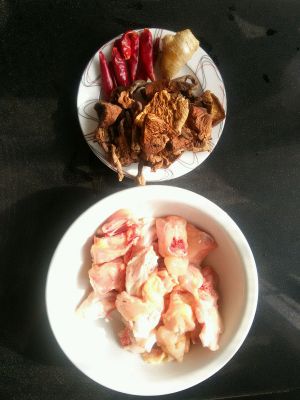 准备食材,榛蘑提前一晚泡好,鸡肉焯水