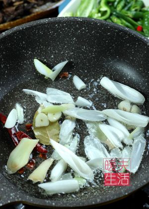 先用热油,把葱姜蒜,香叶,干辣椒,八角爆香