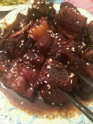 锅里倒油、葱姜煸香倒入小排,煎至两面发黄,倒入老抽两勺生抽一勺!醋一勺、加盐、加入冰糖!料酒一点点