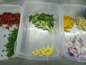 青椒,蒜苗切段,喜欢吃辣可以加入小红朝天椒。葱姜切碎并拍几瓣大蒜。
