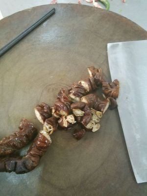 切段.热油下入肥肠,翻炒