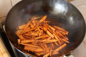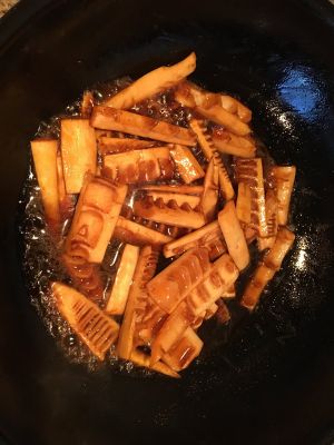油烧到7成热,下姜末煸炒出香味,放入焯好的笋煸炒,然后烹入料酒,盖上盖子焖一下,开盖调入碗汁,翻炒一两分钟即可出锅。