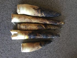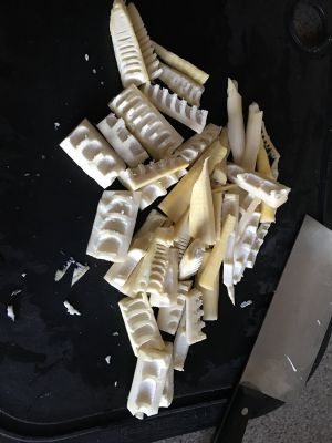 春笋去皮去老根去硬皮,老根可留作熬汤,切滚刀块,滚刀块可切段笋的纤维防止老,判断老不老的办法就是看指甲能否掐进去(我这次的笋比较嫩,为了好看切得段状)。姜切末