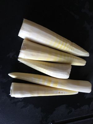春笋剥皮去老根之后切成条状,焯水去除涩味。