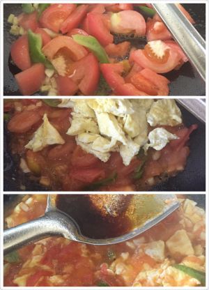 放西红柿继续翻炒,然后倒入煎好的鸡蛋翻炒片刻,加盐、鸡粉、生抽翻炒均匀即可