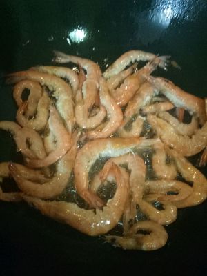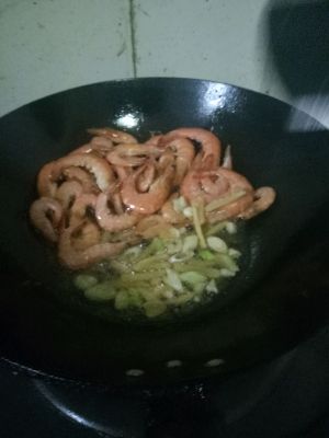 倒进虾翻炒,用铲子按虾头按出虾油