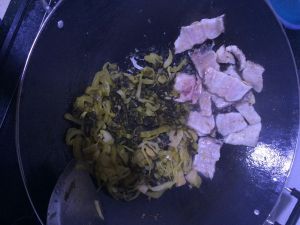 此时试一下味道,要加盐的就加盐了,因为我的酸菜很咸所以我就不加盐了。加入少许鸡粉增鲜。