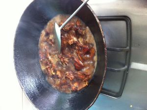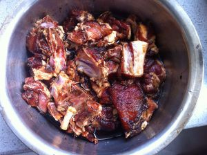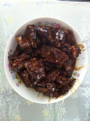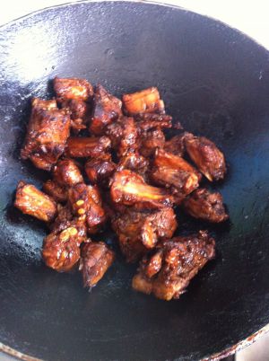 把排骨挑出来单独放在一个碟子里【汁要留着有用】热锅 倒油然后把排骨放进锅里放盐放糖放醋【个人偏甜】翻炒 然后把汁倒入锅里煮,如果骨头大的话就多煮一会,
