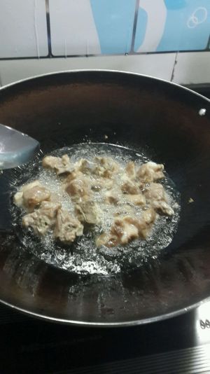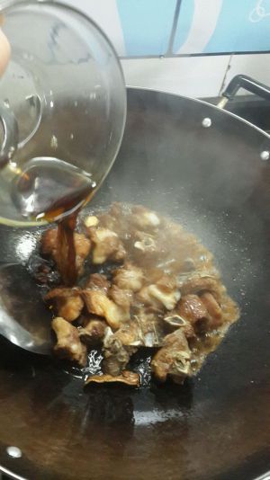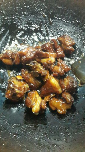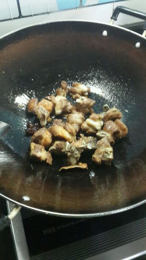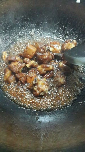 锅中下油,同时下冰糖炒化,直到糖水呈褐色,并开始冒泡,加入排骨翻炒上色,至排骨均匀着色