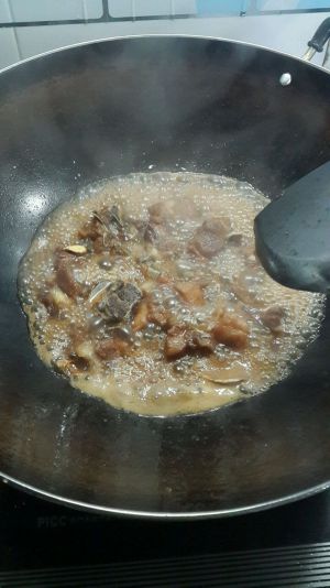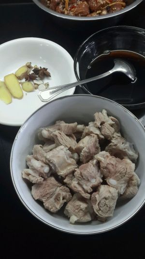 待上色完全,加入姜片两片,料酒、生抽、醋及适量热水,没过排骨,待沸腾后转中小火炖煮二十分钟