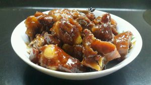 我们先调酱汁。 直径4.5cm普通圆勺,或者用家里普通的瓷勺都行,提醒一下如果家里勺太小请加倍: 白糖---3勺 醋------2勺 酱油---1勺 料酒---1勺 水------8勺 混合成汁。最好可以提前调好,让白糖溶化在一起。