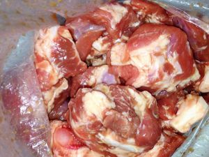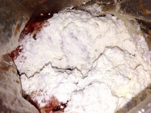 如果食品袋里水份不是很多的话就直接倒入淀粉,如果水份渗出多的话,倒掉水份再加入淀粉,轻揉后再放置5分钟左右。