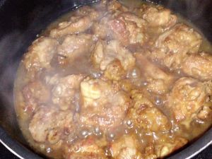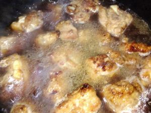 看到这样的时候就开始挂汁了,把火关到小火上,不停的用铲子翻炒。让每一块都能均匀上汁。