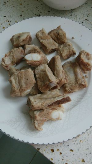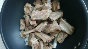凉水加入排骨(生姜 葱)开火焯水,约煮30分钟