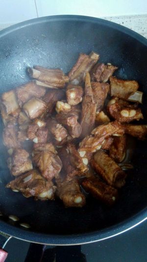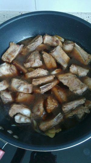 把糖色搅拌均匀下排骨,水要差不多没过排骨