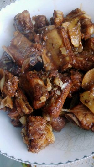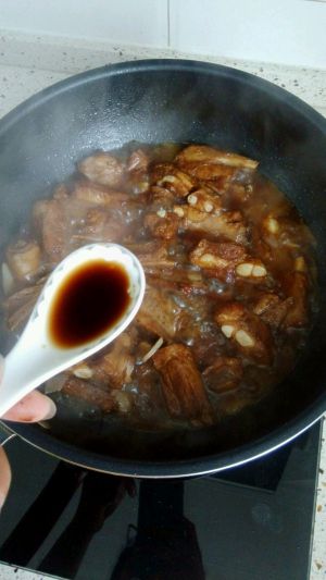 加入量大概就是一酱碟。 在收汁时反复翻炒,一定要均匀布满每一块排骨中。