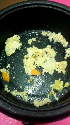 锅里加入少许的油,等油温八成热时,下入蒜粒煸炒出香味