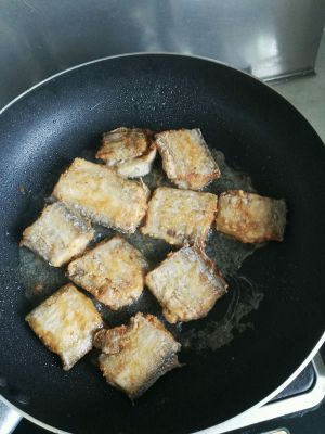平底锅加油少许,带鱼粘少许淀粉放锅中小火煎黄。注意不要用铲孑翻动易碎,轻轻晃动即可。