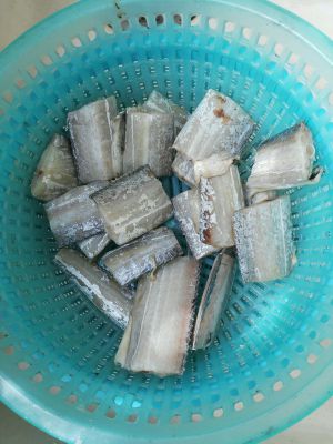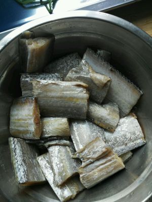 带鱼洗净沥干,最好吃的前一天准备,这样带鱼烧时不破。