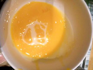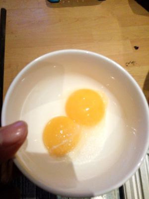 打好的2个蛋黄,没有打蛋器,纯手工操作