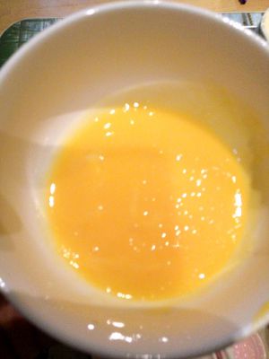 准备两个鸡蛋黄打均匀,放入溶解的牛奶液里,搅匀