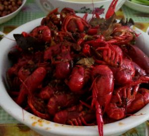 锅中油烧七成熟,倒入小龙虾,小火炸2分钟。