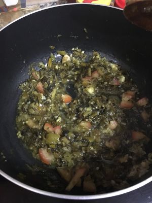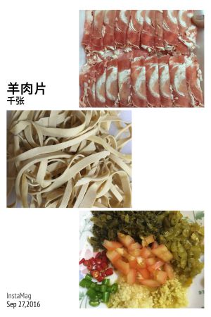 准备好食材,有羊肉片、千张切丝、葱姜切末、小米椒切段、虎皮椒切段、番茄切丁,还有雪菜和剁椒