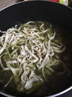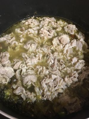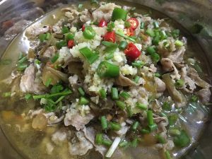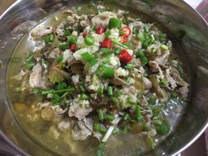 煮开后把羊肉片捞起,在加点米醋,最后把汤汁浇上去,放上蒜末,小米椒和虎皮椒段,接着在热点油浇上去,撒上葱花