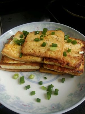 一面煎黄后翻面,两面都煎黄后,加水(水量正好淹没豆腐就好),加少许盐,待汤汁收了以后出锅。