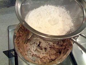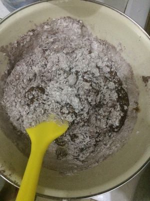 将低筋面粉和巧克力粉拌匀,过筛后加入牛油糊(^_^)