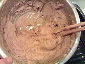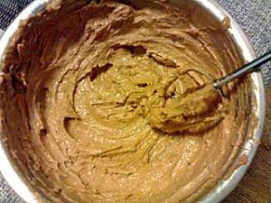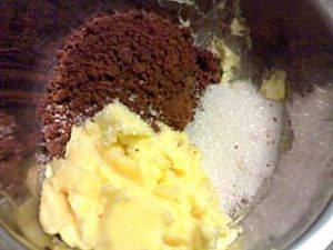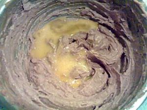 先把黄油室温融化,用手动打蛋器打匀!加入糖粉打匀,打匀后加入白砂糖!分三次加入打散的鸡蛋,打匀!打至绵软即可!再加入过筛了的低筋面粉和可可粉,拌匀。
