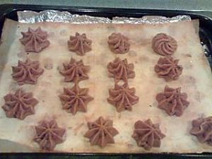 我把和好的面糊放到裱画袋里,挤在油布上。没有裱画袋,用小勺盛就行,因为我做的是软曲奇,烤的时候它就会塌下来的,没有什么形状。我之所以用裱画袋是因为我用勺盛的大小不均匀,用裱画袋挤曲奇的大小我好控制。