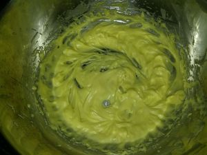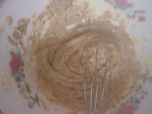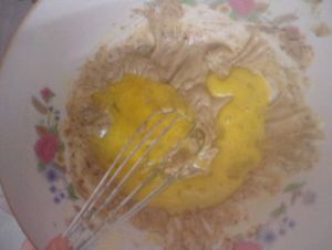 把这三样东西充分的搅拌,让它们完全的融化,搅倒颜色略变,黄油略发就可以了。这可是件力气活,我搅了半集《快乐生活一点通》才搅好的。这一步很关键,直接影响曲奇的成功。
