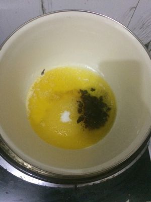 黄油加热液化,然后加入细砂糖、红糖、盐、香草精搅拌均匀。