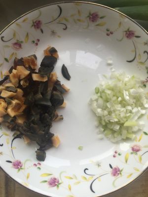 鸡胸肉切小丁加姜 2g盐 油 淀粉 水 白胡椒1g抓匀焯熟 皮蛋切碎 备用