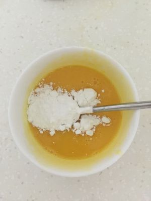 蛋黄用手动打蛋器打至均匀细腻的蛋黄糊后加入过筛的玉米淀粉,搅拌至无干粉的糊状。