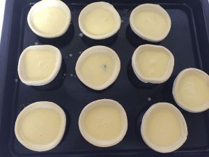 再在挞皮内注入挞液,注意保持八分满的状态,避免烤制过程中挞液受热溢出。